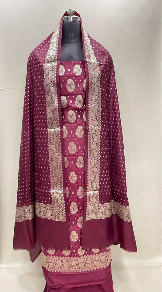 Wine semi-georgette suit set with floral silver zari bootis and matching dupatta. SHL_40