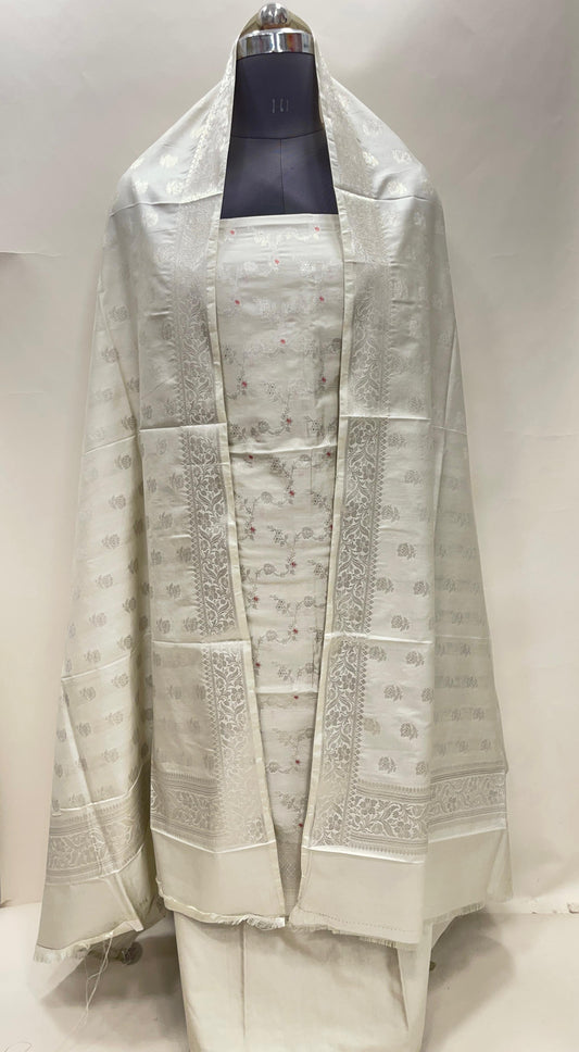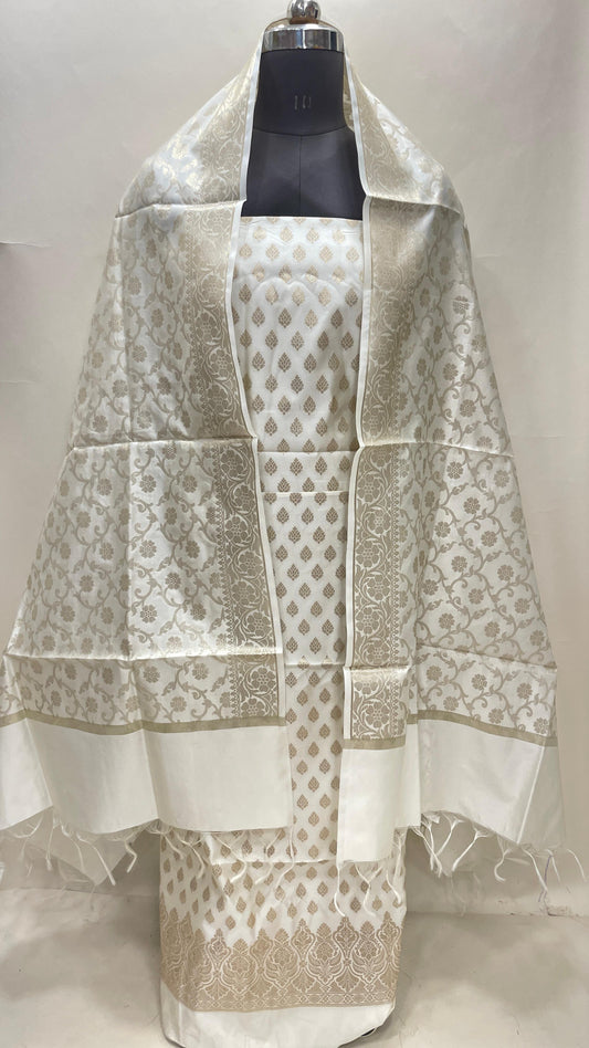 White art silk suit set with floral zari bootis and matching dupatta. SHL_64