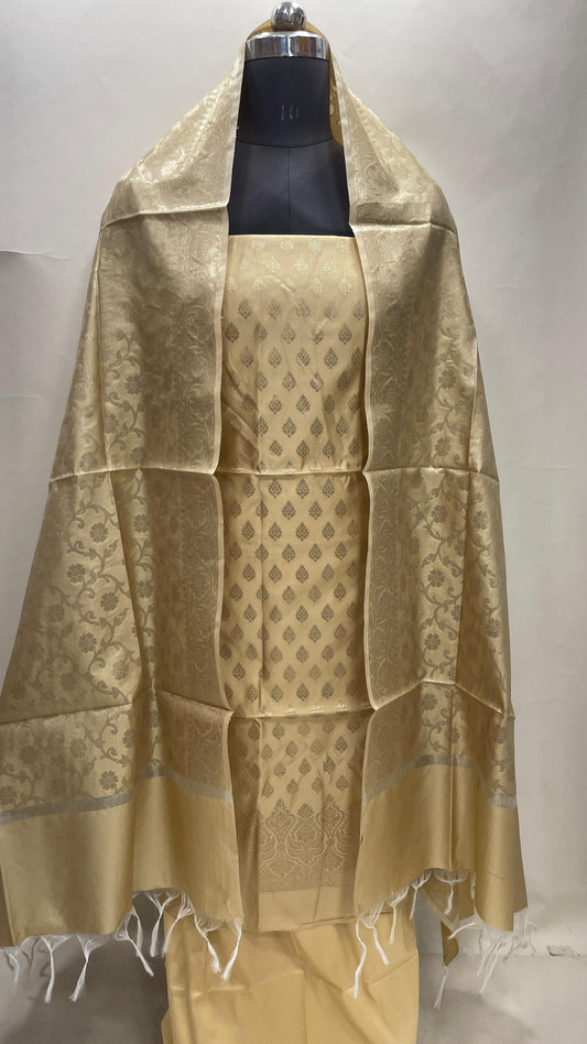 Cream art silk suit set featuring floral zari bootis and matching dupatta. SHL_62