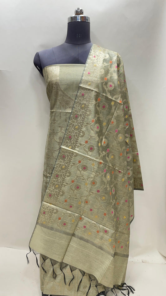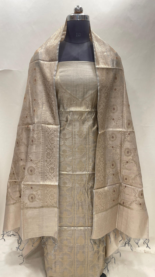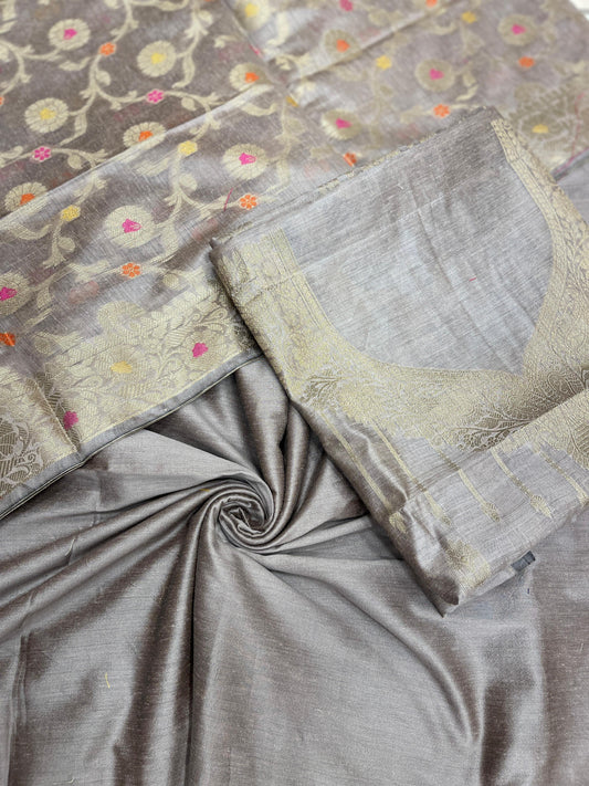 Tussar katan chiniya silk suit set with floral silver zari mina jaal dupatta. SHL_47