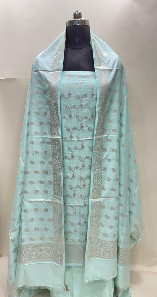 Faishana Presents Sky Blue Semi Katan Silk Floral Minakari Jaal 3 pcs Suit Set with Contrast Green Bottom and Minakari Floral Booti Light Green Dupatta ASD_149