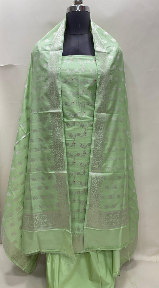 Light green katan chiniya silk suit set with floral silver zari mina jaal dupatta. SHL_50