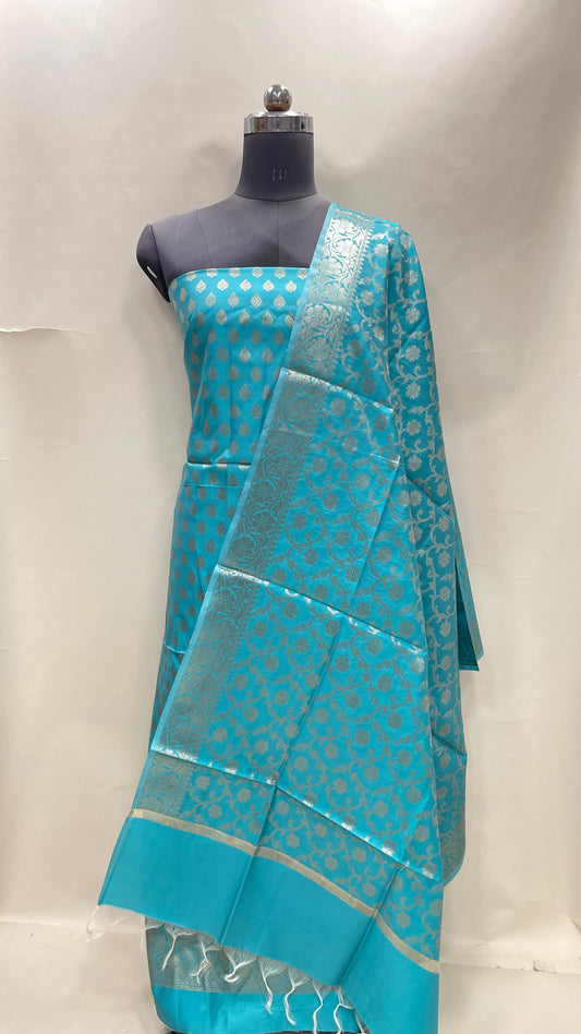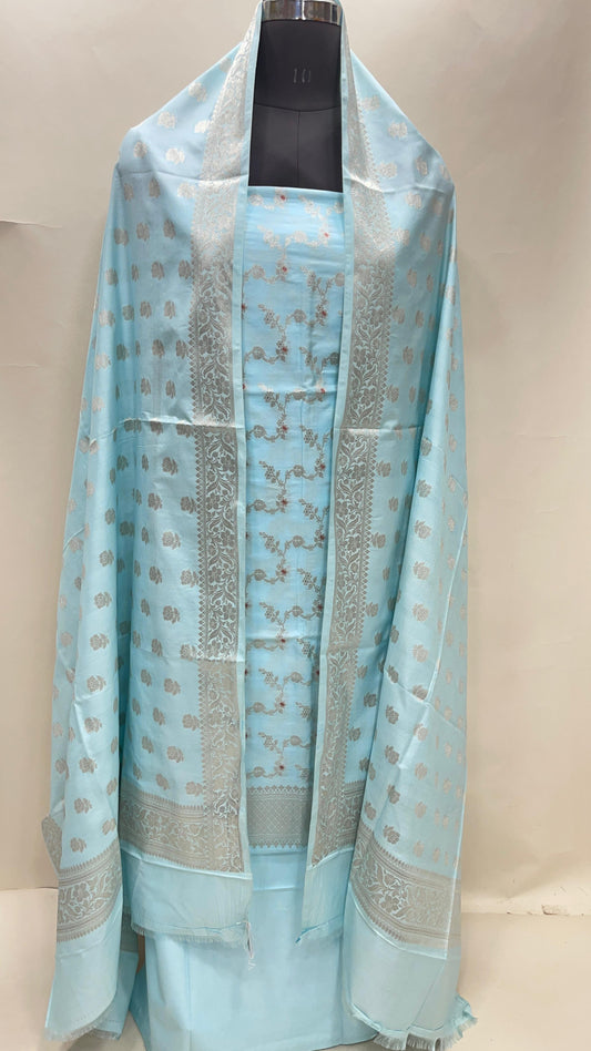 Sky blue katan chiniya silk suit set with floral silver zari mina jaal dupatta. SHL_48