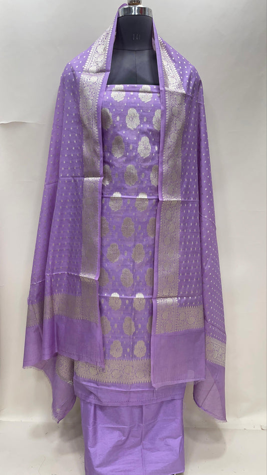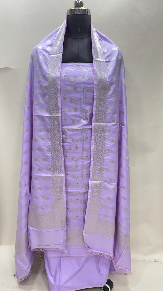 Light purple semi-georgette suit set with floral silver zari bootis and matching dupatta. SHL_42