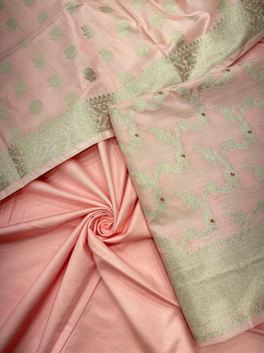 Peach katan chiniya silk suit set with floral silver zari mina jaal dupatta. SHL_45