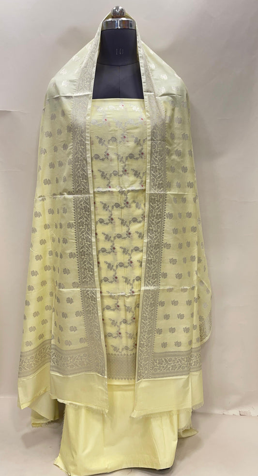 Yellow katan chiniya silk suit set with floral silver zari mina jaal dupatta. SHL_44