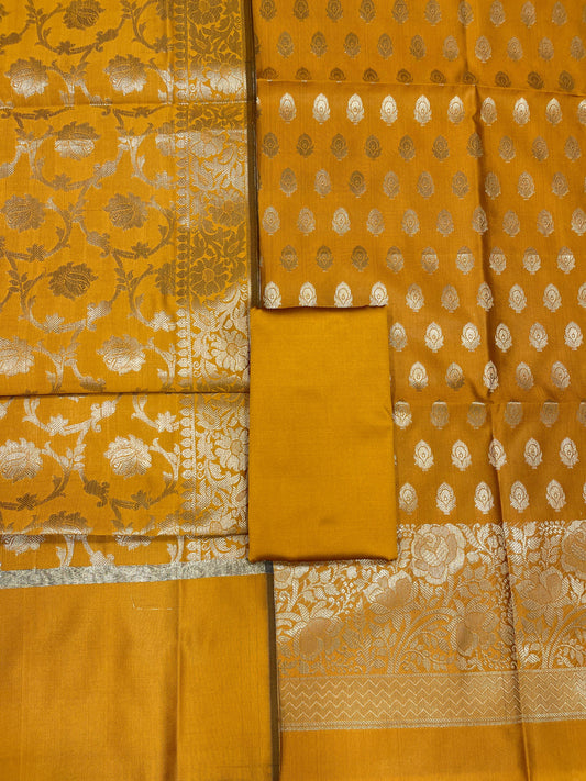 Faishana Presents Mustard Gold Semi Katan Silk Floral Minakari Booti Stripe 3 pcs Suit Set with Plain Bottom and Minakari Floral Zari Jaal Mustard Gold Dupatta ASD_145
