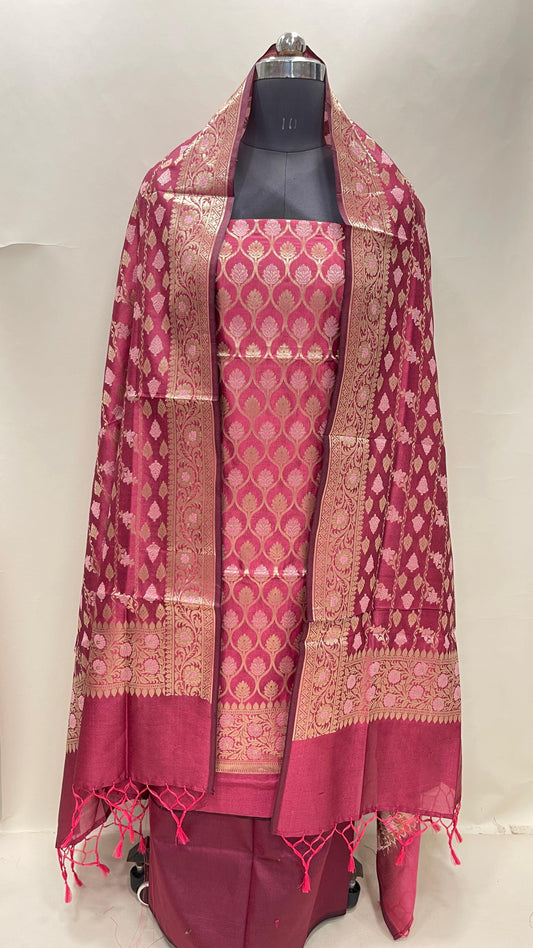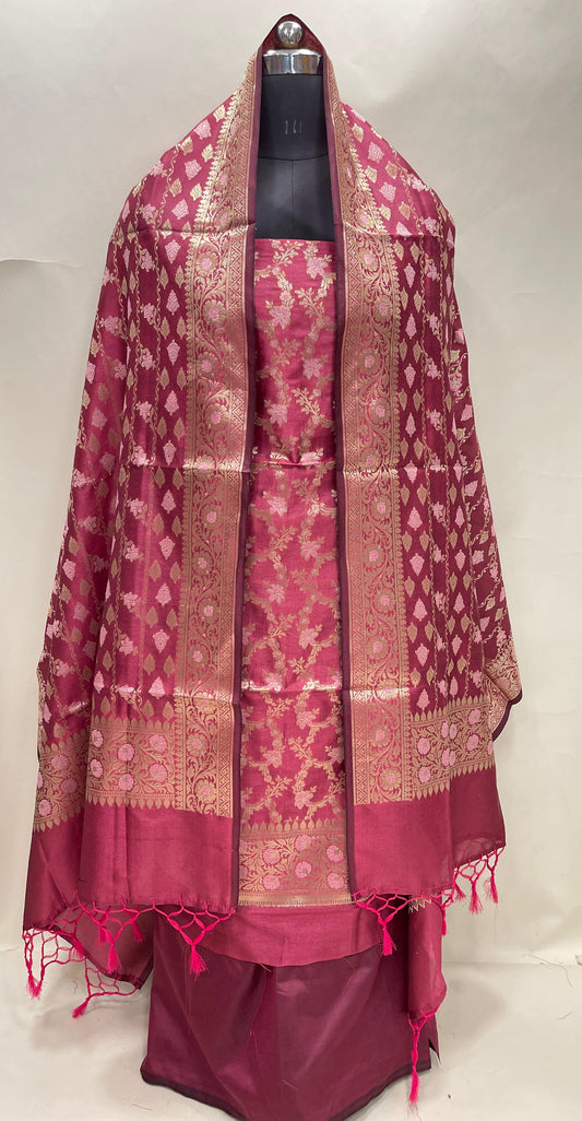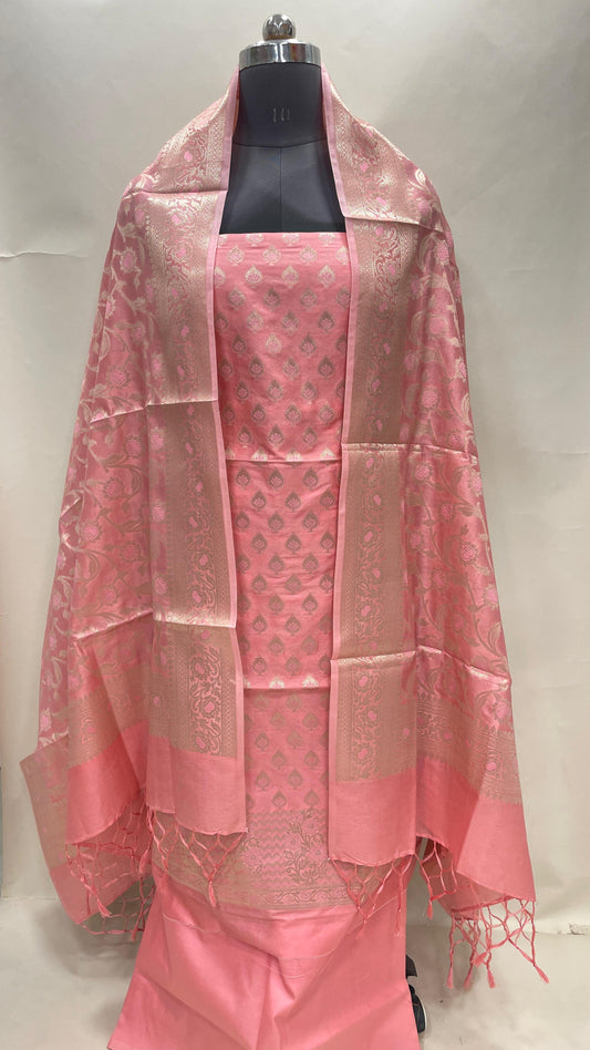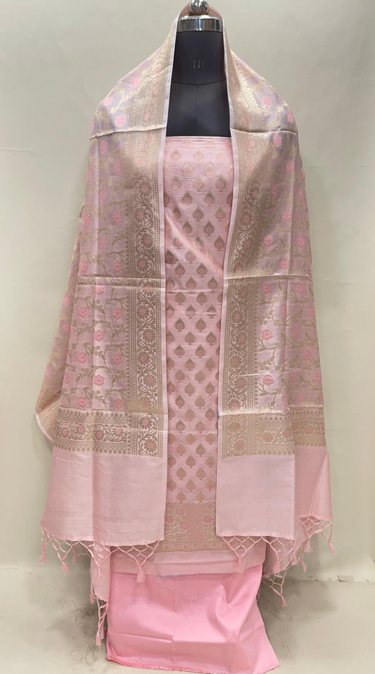 Faishana Presents Pink Semi Katan Silk 3 pcs Suit Set with Plain Bottom and Top Floral Minakari Zari Booti with Stripe Mina Pink Dupatta ASD_107