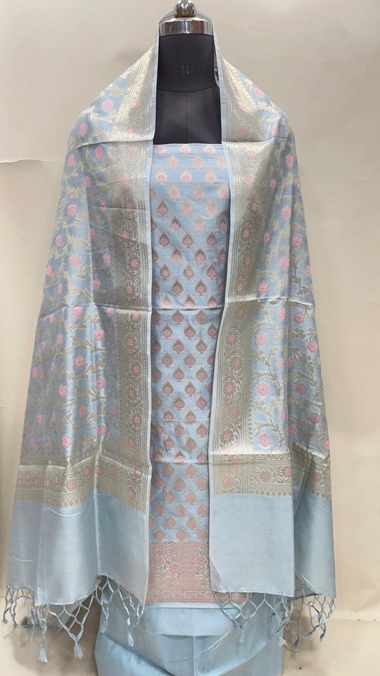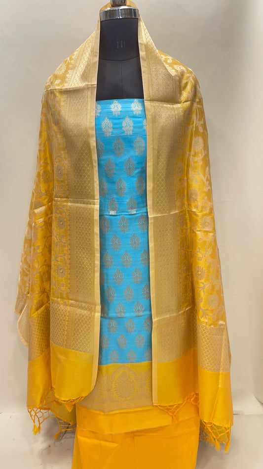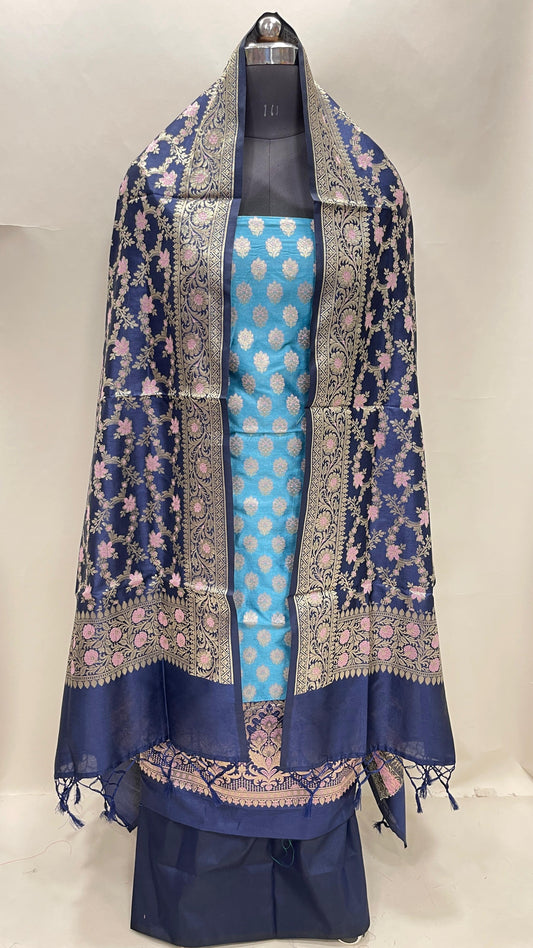 Faishana Presents Blue Semi Katan Silk 3 pcs Suit Set with Contrast Navy Blue Plain Bottom and Top Floral Zari Booti with Alfi Jaal Navy Blue Dupatta ASD_115