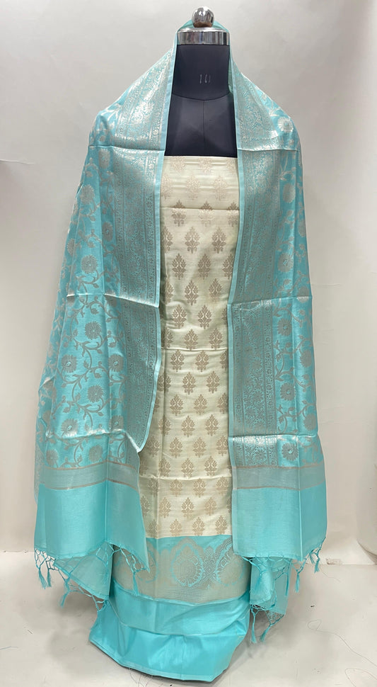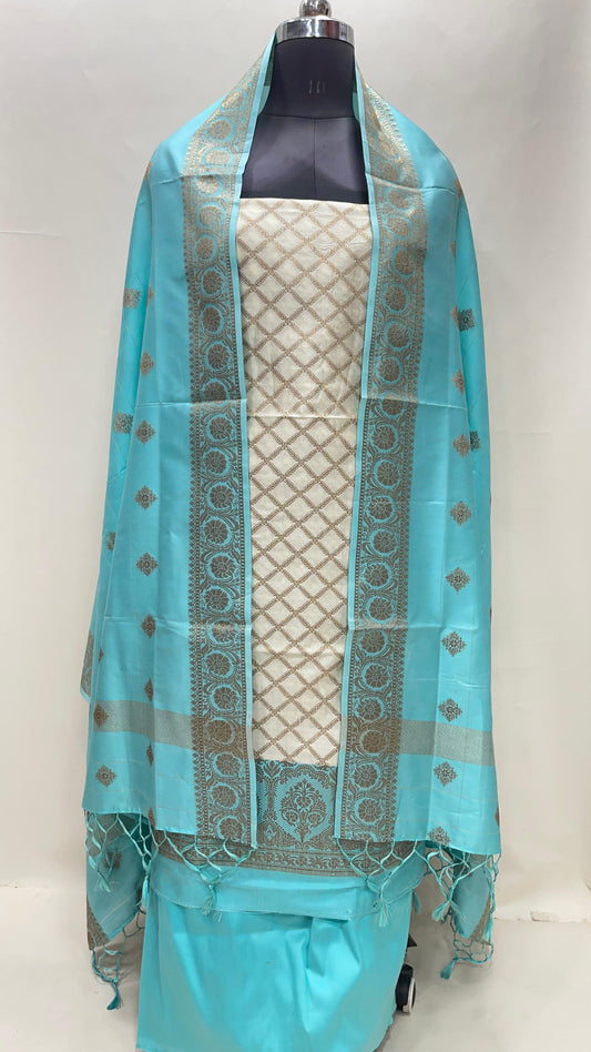 Faishana Presents Off white Semi Katan Silk Checkered Striped 3 pcs Suit Set with Contrast Sky Blue Plain Bottom and Floral Zari Booti Sky Blue Dupatta ASD_129