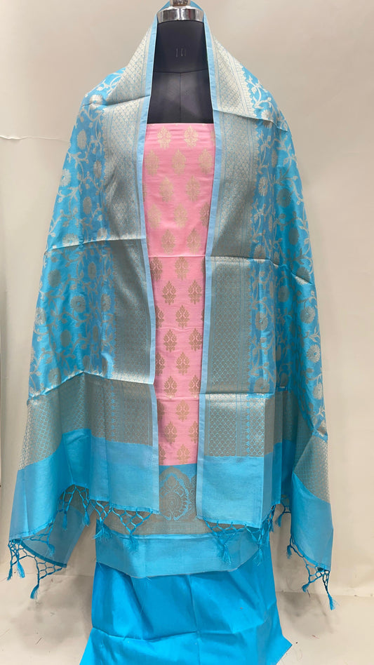 Faishana Presents Baby Pink Semi Katan Silk Floral Zari Booti 3 pcs Suit Set with Contrast Blue Plain Bottom and Tilfi Jaal Blue Dupatta ASD_123