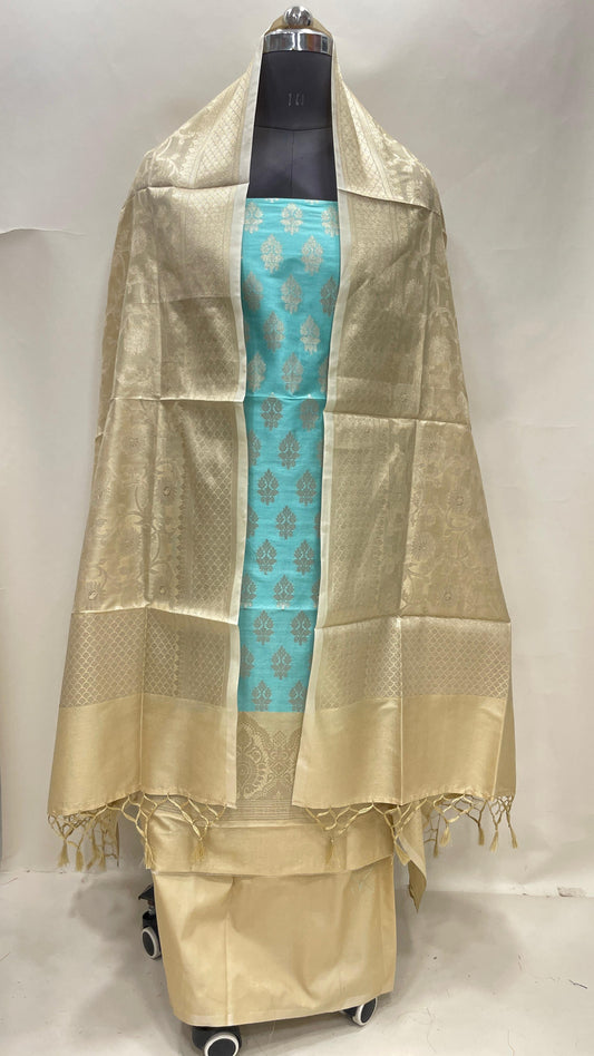 Faishana Presents Blue Semi Katan Silk Floral Zari Booti 3 pcs Suit Set with Contrast Gold Plain Bottom and Tilfi Jaal Gold Dupatta ASD_122