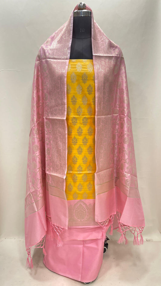 Faishana Presents Gold Semi Katan Silk Floral Zari Booti 3 pcs Suit Set with Contrast Pink Plain Bottom and Tilfi Jaal Baby Pink Dupatta ASD_125