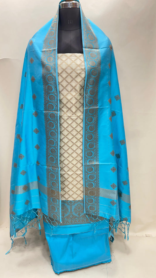 Faishana Presents Off white Semi Katan Silk Checkered Striped 3 pcs Suit Set with Contrast Blue Plain Bottom and Floral Zari Booti Blue Dupatta ASD_126