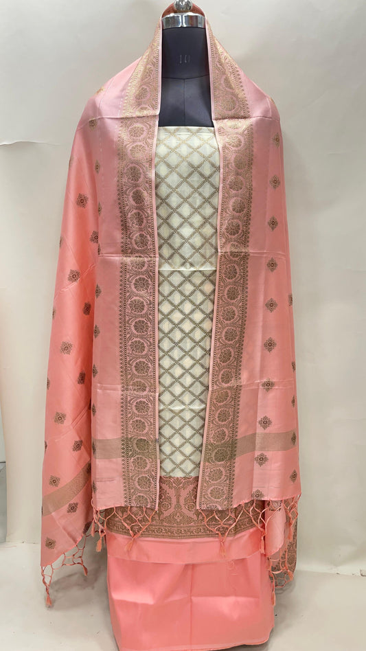 Faishana Presents Off white Semi Katan Silk Checkered Striped 3 pcs Suit Set with Contrast Peach Plain Bottom and Floral Zari Booti Peach Dupatta ASD_127