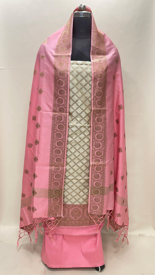 Faishana Presents Off white Semi Katan Silk Checkered Striped 3 pcs Suit Set with Contrast Baby Pink Plain Bottom and Floral Zari Booti Baby Pink Dupatta ASD_130