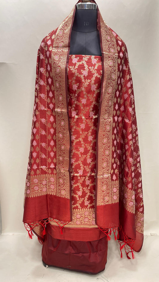Faishana Presents Red Floral Minakari Zari Jaal 3 pcs Suit Set with Plain Bottom and Lehariya Stripe Minakari Booti Red Dupatta ASD_133