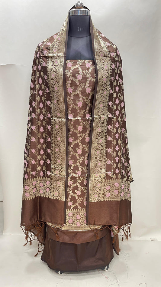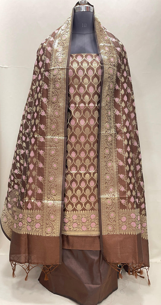Faishana Presents Brown Semi Katan Silk 3 pcs Suit Set with Plain Bottom and Top Floral Minakari Zari Booti with Stripe Mina Brown Dupatta ASD_106