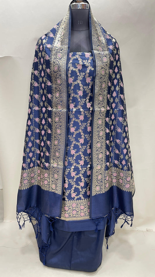 Faishana Presents Navy Blue Semi Katan Silk 3 pcs Suit Set with Plain Bottom and Top Floral Minakari Zari Booti with Stripe Mina Navy Blue Dupatta ASD_109