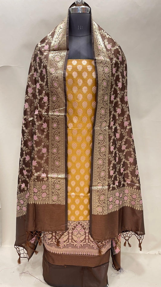 Faishana Presents Mustard Gold Floral Zari Booti 3 pcs Suit Set with Contrast Brown Plain Bottom and Floral Minakari Zari Jaal Brown Dupatta ASD_138