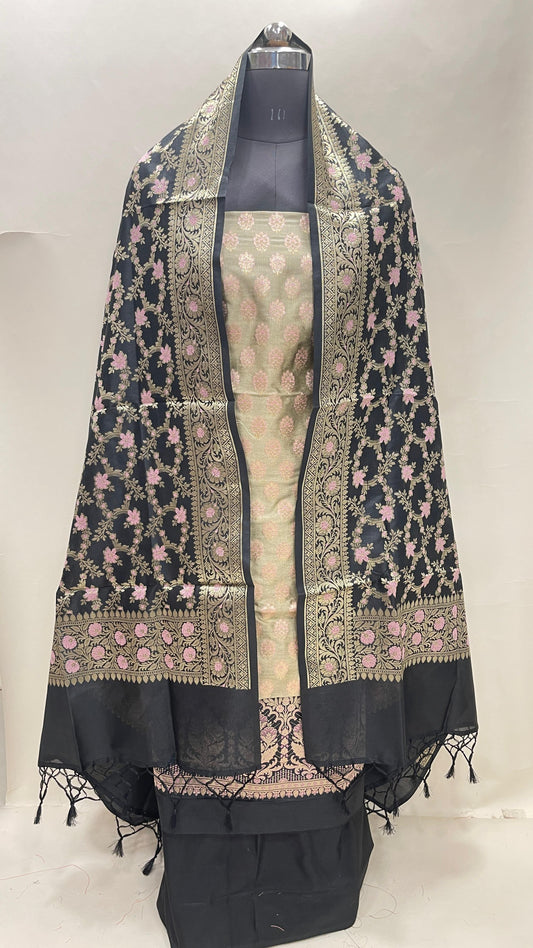 Faishana Presents Olive Semi Katan Silk 3 pcs Suit Set with Contrast Black Plain Bottom and Top Floral Zari Booti with Alfi Jaal Black Dupatta ASD_112
