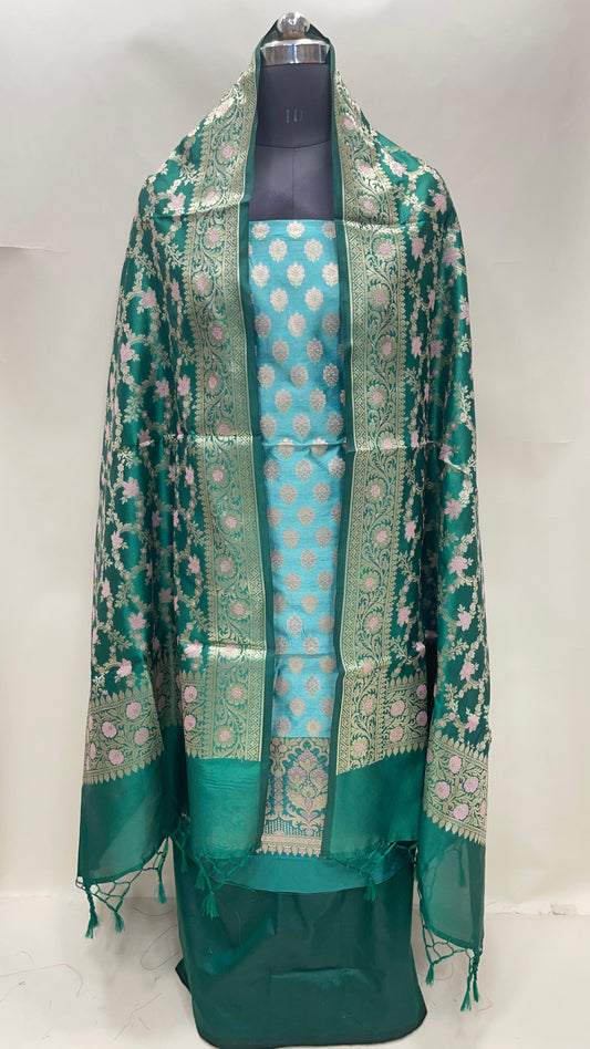 Faishana Presents Sea Green Semi Katan Silk 3 pcs Suit Set with Plain Bottom and Top Floral Minakari Zari Booti with Stripe Mina Sea Green Dupatta ASD_108