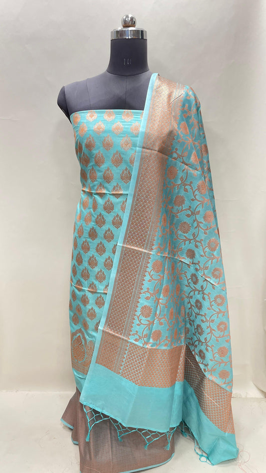 Faishana Presents Sea Green Semi Katan Silk 3 pcs Suit Set with Plain Bottom and Top Copper Floral Zari Booti with Copper Zari Jaal Dupatta ASD_105