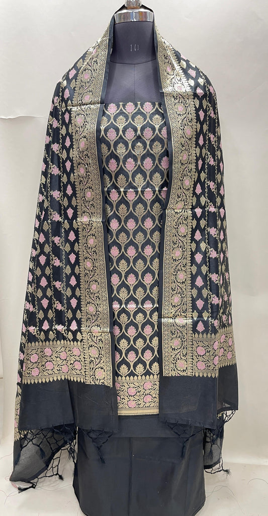 Faishana Presents Black Semi Katan Silk 3 pcs Suit Set with Plain Bottom and Top Floral Minakari Zari Booti with Stripe Mina Black Dupatta ASD_111