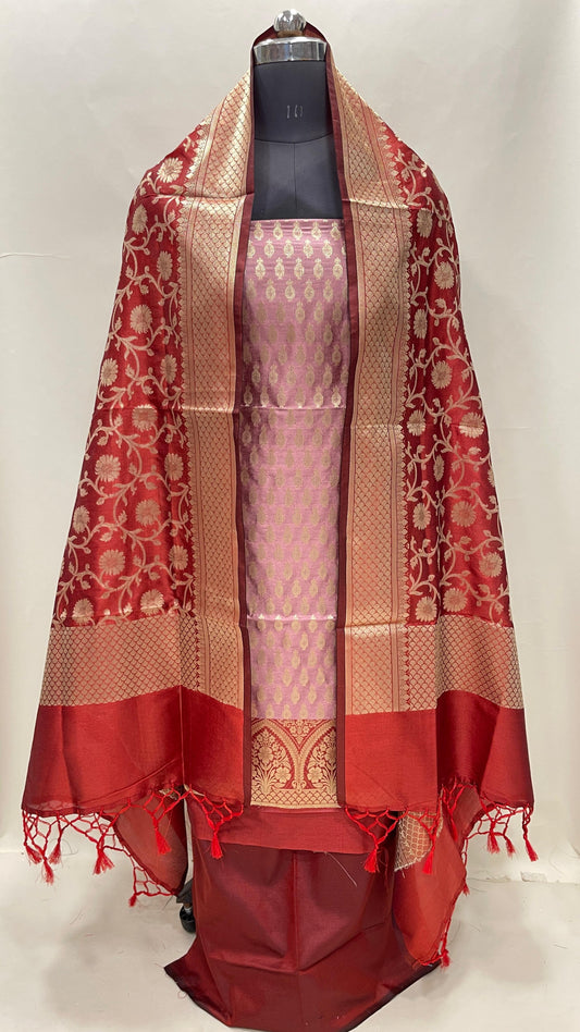 Faishana Presents Baby Pink Semi Katan Silk 3 pcs Suit Set with Contrast Red Plain Bottom and Top Floral Zari Booti with Alfi Jaal Red Dupatta ASD_113