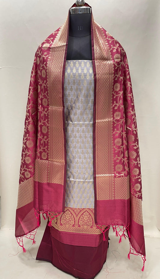 Faishana Presents Grey Semi Katan Silk 3 pcs Suit Set with Contrast Magenta Plain Bottom and Top Floral Zari Booti with Alfi Jaal Magenta Dupatta ASD_114
