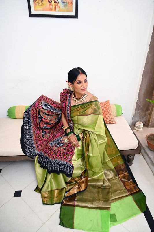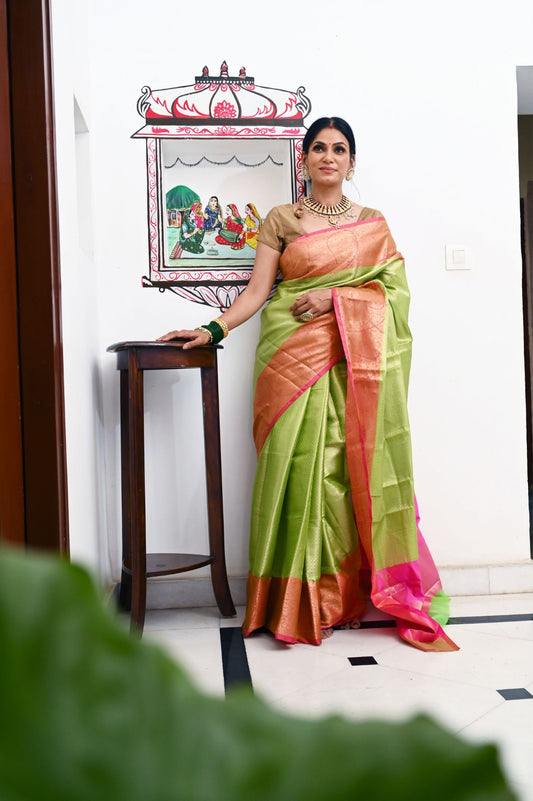 Lime Green Kanchi Silk Banarasi Sarees For Women GEBE11