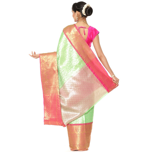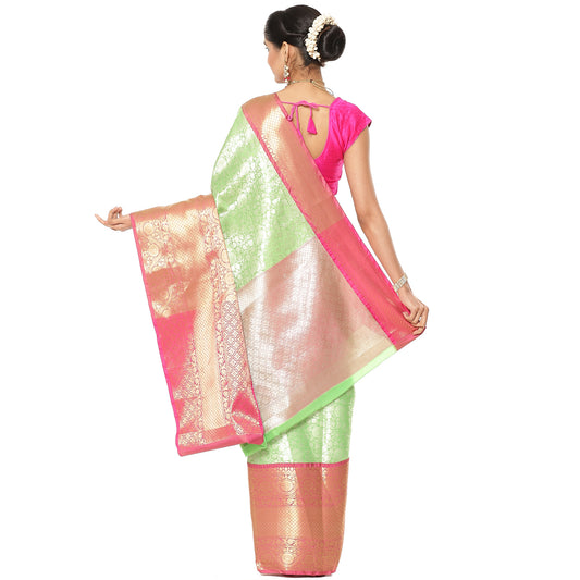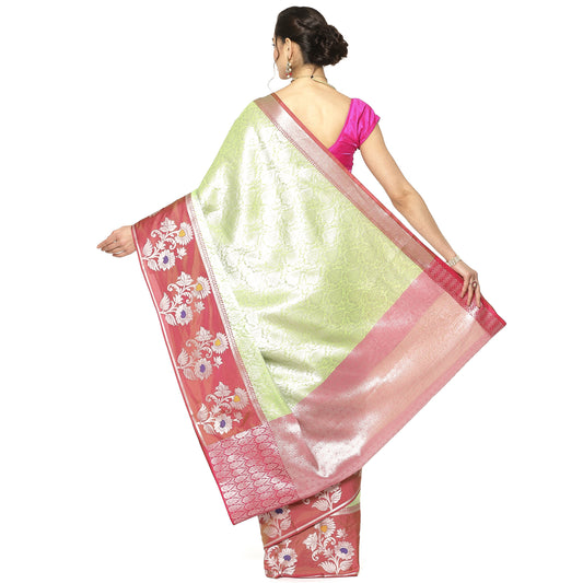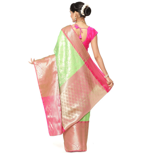 Faishana Presents Presents Green Kanchi Silk Zari Brocade Contrast Zari Brocade Pink Pattu Border Banarasi Saree.