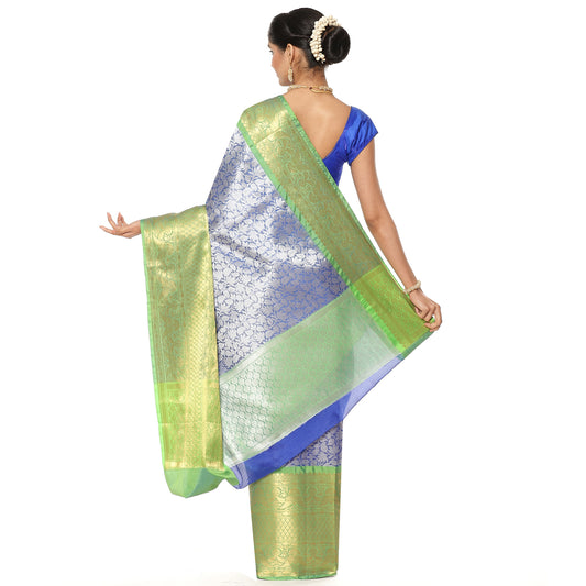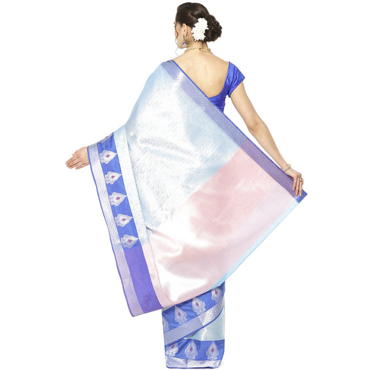 Faishana Presents Blue Silver Zari Kanchi Silk Tanchoi Brocade Contrast Gold Skirt Meena Border Banarasi Saree