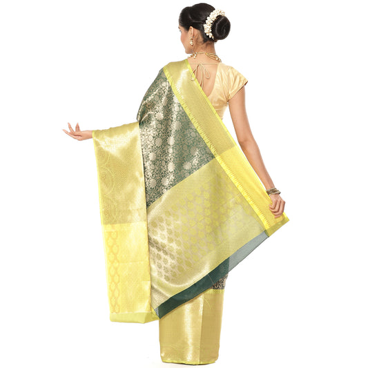 Faishana Presents Green Silver Zari Kanchi Silk Tanchoi Brocade Contrast Gold Skirt Meena Border Banarasi Saree