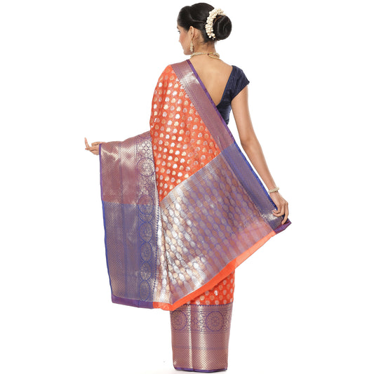 Faishana Presents Presents Orange Silver Gold Zari Chunri Booti Contrast Blue Pattu Border Banarasi Saree.