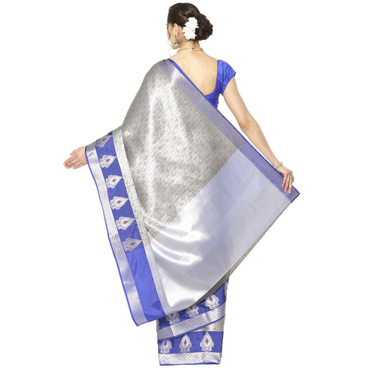 Faishana Presents Grey Silver Zari Kanchi Silk Tanchoi Brocade Contrast Blue Skirt Meena Border Banarasi Saree