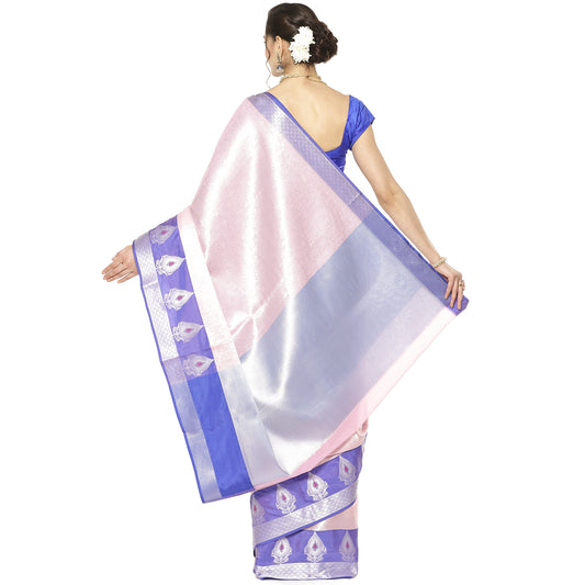 Faishana Presents Pink Silver Zari Kanchi Silk Tanchoi Brocade Contrast Blue Skirt Meena Border Banarasi Saree