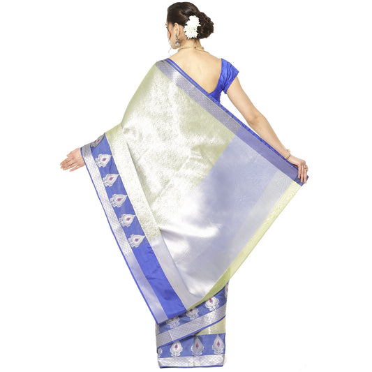Faishana Presents Gold Silver Zari Kanchi Silk Tanchoi Brocade Contrast Blue Skirt Meena Border Banarasi Saree