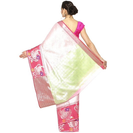 Faishana Presents Green Silver Zari Kanchi Silk Tanchoi Brocade Contrast Pink Skirt Meena Border Banarasi Saree