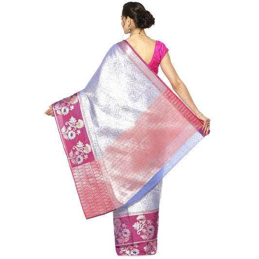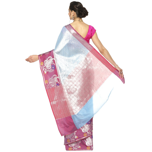 Faishana Presents Blue Silver Zari Kanchi Silk Tanchoi Brocade Contrast Magenta Skirt Meena Border Banarasi Saree