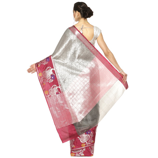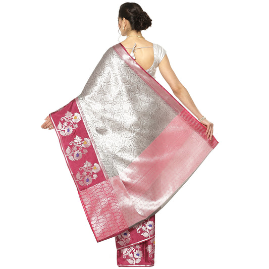 Faishana Presents Grey Silver Zari Kanchi Silk Tanchoi Brocade Contrast Pink Skirt Meena Border Banarasi Saree