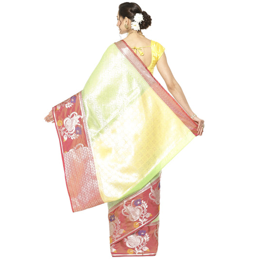 Faishana Presents Presents Green Kanchi Silk Zari Brocade Contrast Zari Brocade Red Pattu Border Banarasi Saree.