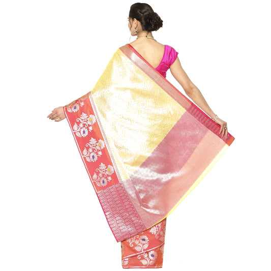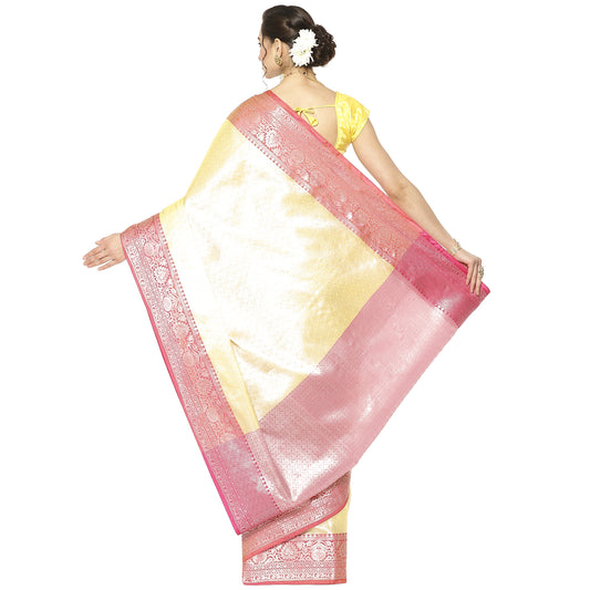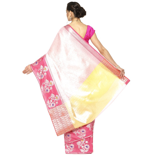 Faishana Presents Gold Silver Zari Kanchi Silk Tanchoi Brocade Contrast Pink Skirt Meena Border Banarasi Saree