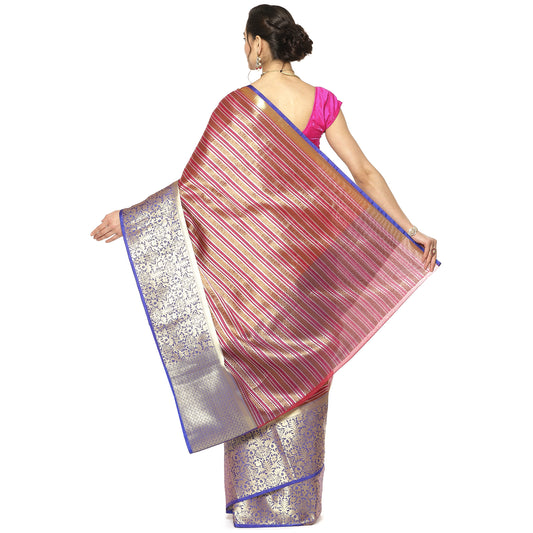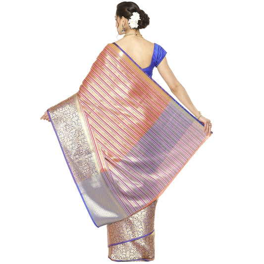 Faishana Presents Light Red Zari Strip Kanchi Silk Tanchoi Brocade Contrast Purple Skirt Border Banarasi Saree