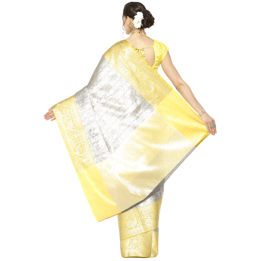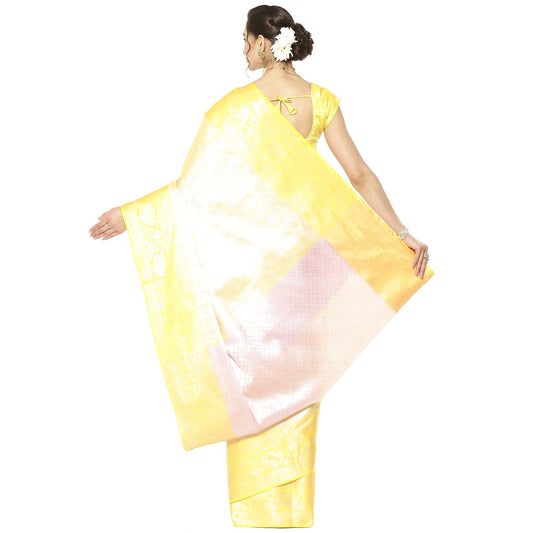 Faishana Presents Gold Silver Zari Kanchi Silk Tanchoi Brocade Contrast Gold Skirt Meena Border Banarasi Saree
