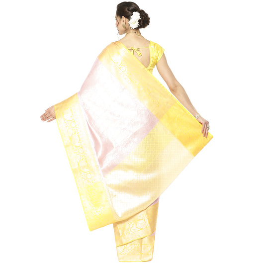 Faishana Presents Pink Silver Zari Kanchi Silk Tanchoi Brocade Contrast Gold Skirt Meena Border Banarasi Saree