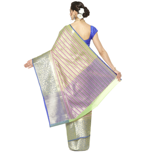 Faishana Presents Green Zari Strip Kanchi Silk Tanchoi Brocade Contrast Torqouise Blue Skirt Border Banarasi Saree