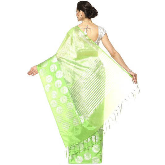 Faishana Presents Green Silver Zari Glass Tissue Tanchoi Contrast Large Border Banarasi Saree