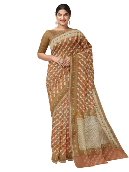 Faishana Presents Peach Cotton Geometric Checked Banarasi Zari Border Banarasi Saree