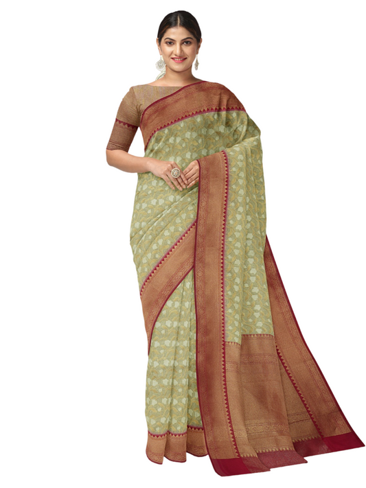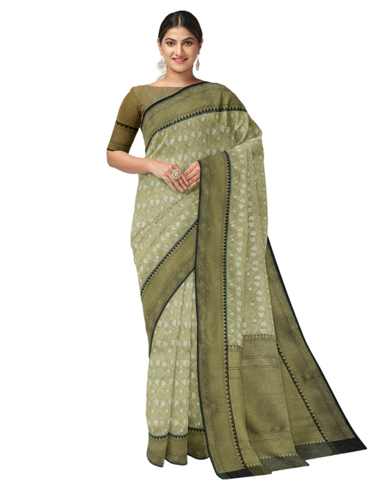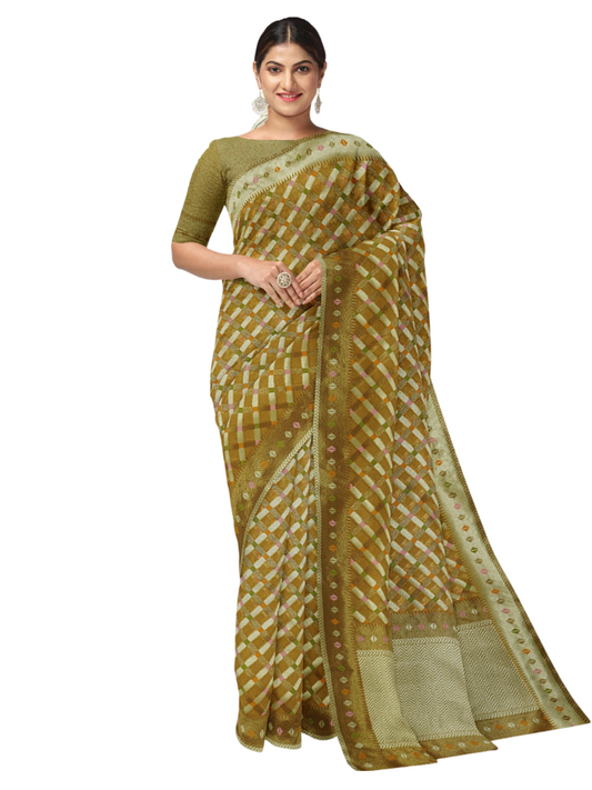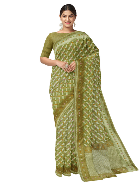 Faishana Presents Presents Green Cotton Geometric Checked Banarasi Zari Border Saree